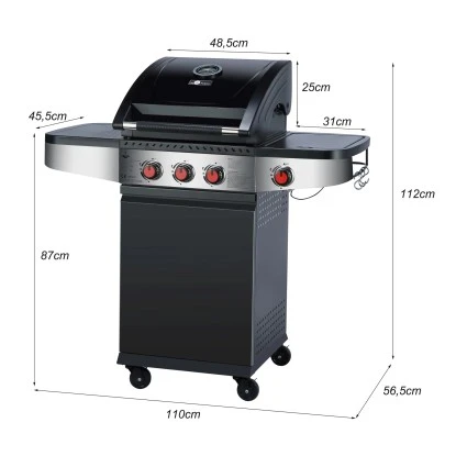 Dieser Gasgrill wird nach hohen Qualitätsstandards gefertigt und entspricht sämtlichen geltenden Normen, um höchstmögliche Sicherheit beim Grillen zu bieten. Das schlichte, hochwertige Design in Kombination mit der hohen Funktionalität des Gerätes, lässt keinerlei Wünsche offen und wird sowohl Besitzer als auch Gäste beeindrucken und die vielfältigen Einstellungsmöglichkeiten dieses Grills erlauben es, jede beliebige Speise optimal zu garen – für eine reichhaltige und gesunde Ernährung. Ein Seitenbrenner ermöglicht zudem zusätzliche Flexibilität, z.B. können Sie damit gleichzeitig eine Soße kochen. Mit einem Gasgrill genießen Sie gegenüber Holzkohlegrills entscheidende Vorteile: Komfort und Nutzbarkeit. Zum Beispiel kann das Garen von Speisen innerhalb von Minuten beginnen, Sie müssen sich keine Sorgen um Holzkohlenrauch machen, der Garvorgang kann präzise gesteuert werden, etc. Das Gerät bietet großzügige Ablagen, sodass Sie alle benötigten Utensilien stets griffbereit haben. Dank der Kunststoffräder kann der Grill bequem und ohne den Boden zu beschädigen transportiert werden.