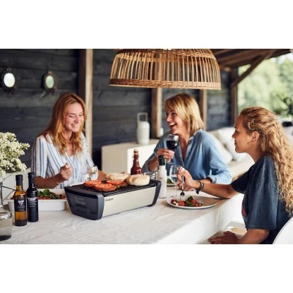 Der Holzkohlegrill aus hochwertigem Edelstahl besticht durch seine hohe Mobilität. Sie können den Grill für Ihren nächsten Campingausflug oder auch auf dem Balkon nutzen. Dank der E-Fan BBQ Lüftertechnologie mit Ventilator ist der Griller besonders leise, raucharm und stufenlos regelbar. Trotzdem müssen Sie nicht auf den typischen Holzkohle-Grillgeschmack verzichten.